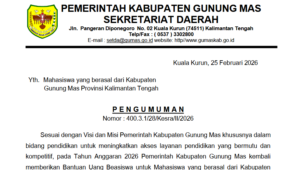 Sesuai dengan Visi dan Misi Pemerintah Kabupaten Gunung Mas khususnya dalam bidang pendidikan untuk meningkatkan akses layanan pendidikan yang bermutu dan kompetitif, pada Tahun Anggaran 2026 Pemerintah Kabupaten Gunung Mas kembali memberikan Bantuan Uang Beasiswa untuk Mahasiswa yang berasal dari Kabupaten Gunung Mas.